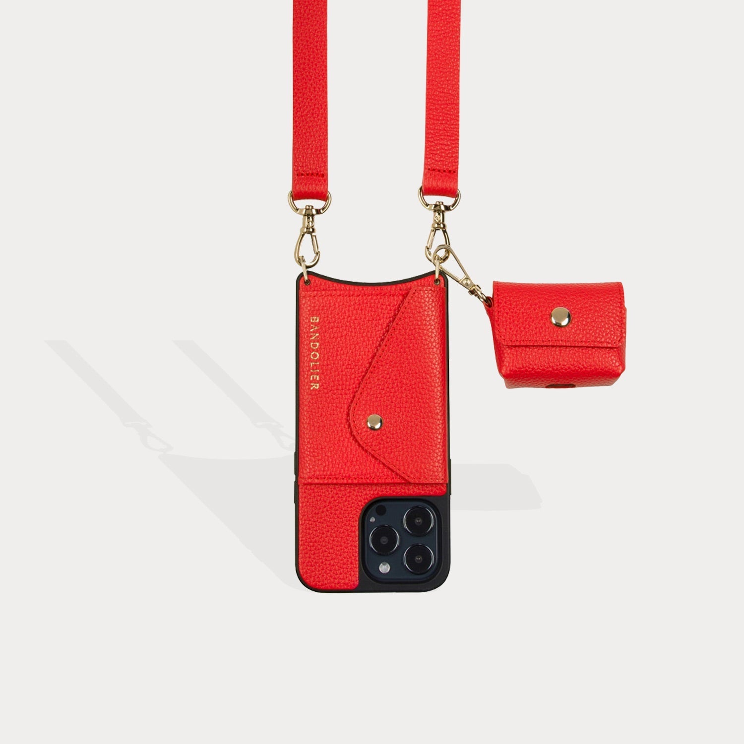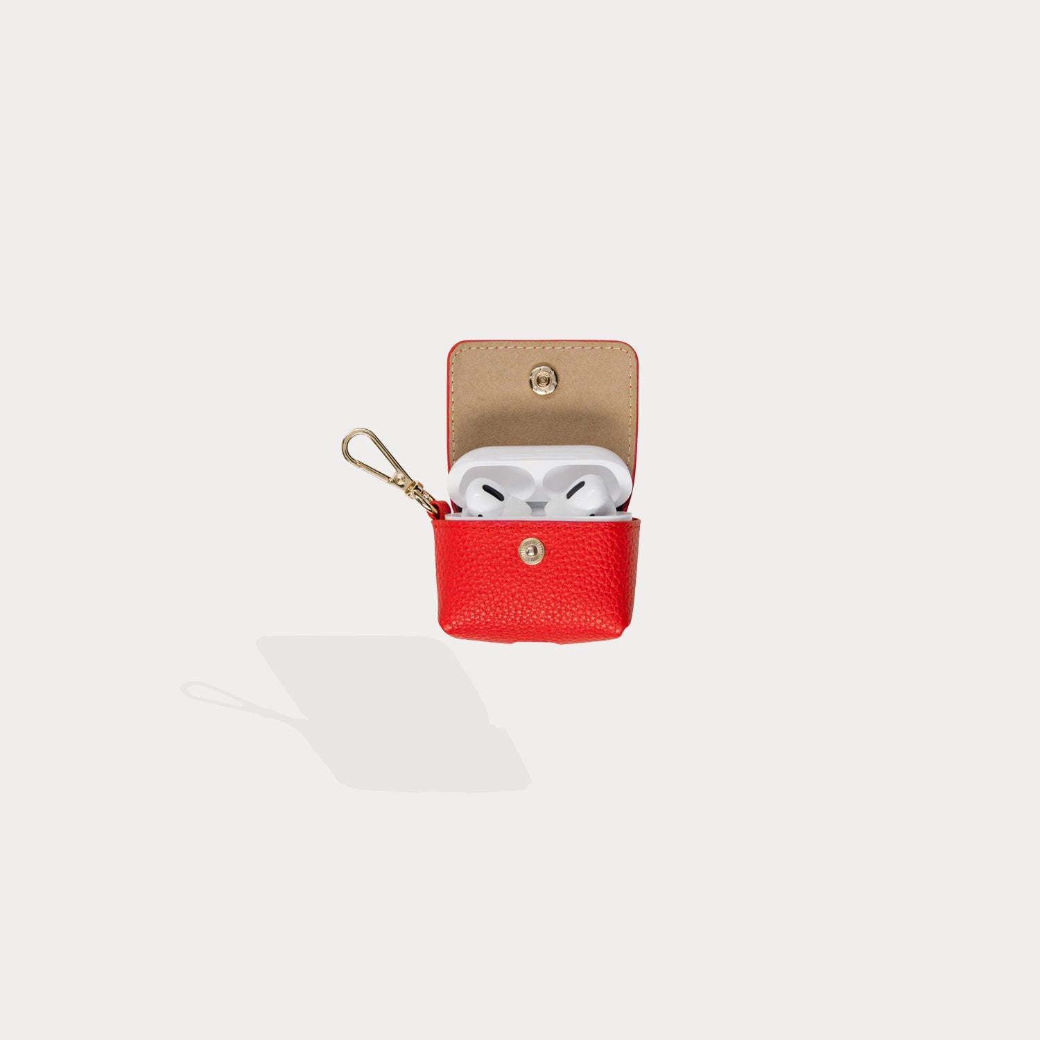 A detachable purse accent fused with practicality, the Avery AirPods Pouch is a patented solution to carrying your easy-to-lose AirPods in style. This red top grain leather clip-on pouch has a gold interior and features a lightweight fold-over snap closure. Add Avery to her Bandolier counterpart or mix and match for a fun new look!