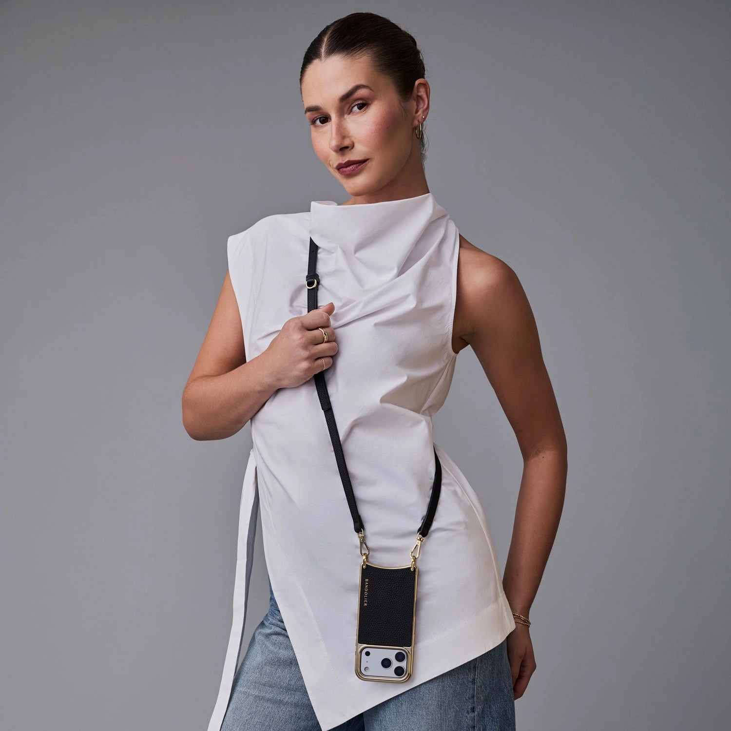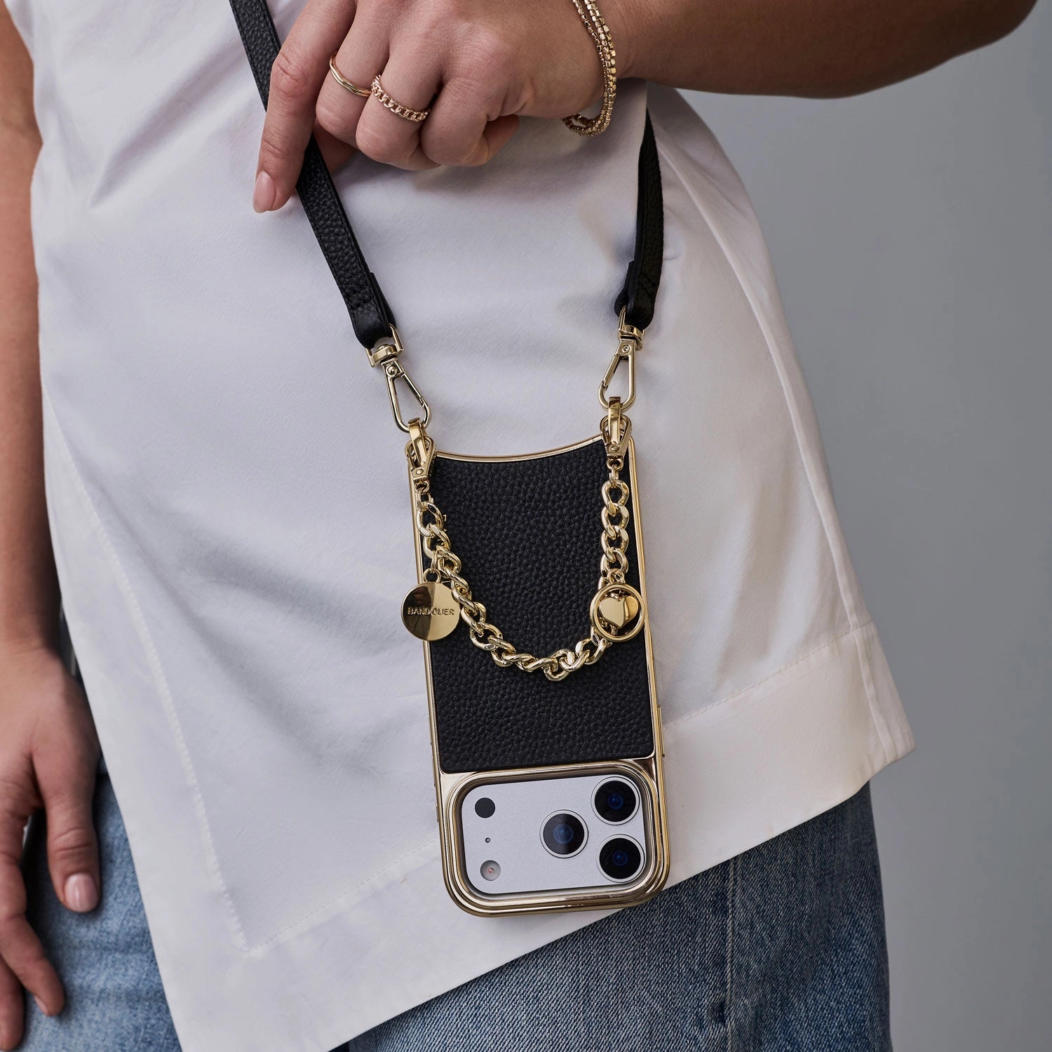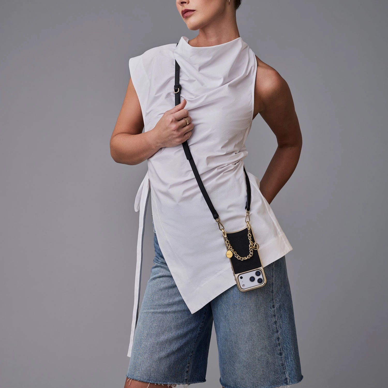 Rayna Crossbody Case and Wristlet Charm in Black/Chrome Gold