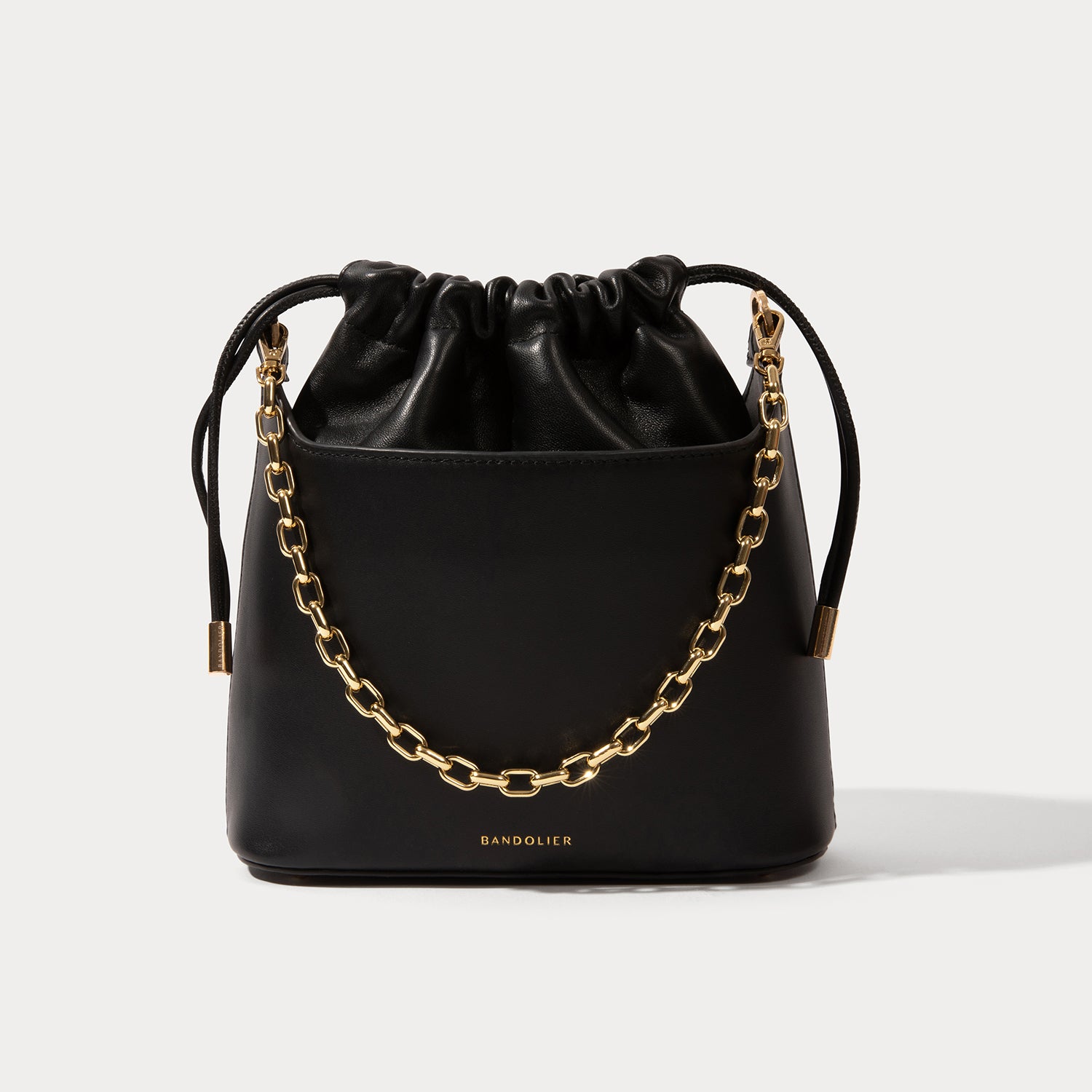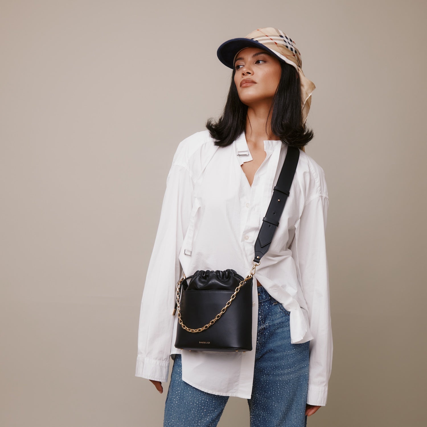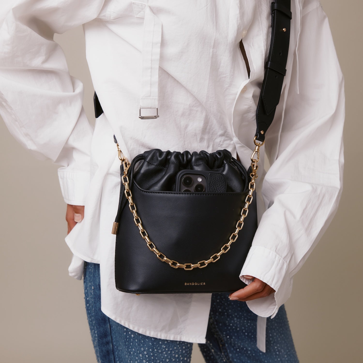 A drawstring bag in an iconic bucket silhouette. Dual straps—crossbody leather and hand-carry length cable chain—add versatile styling options. The signature exterior pocket offers quick access to your phone and other small essentials.