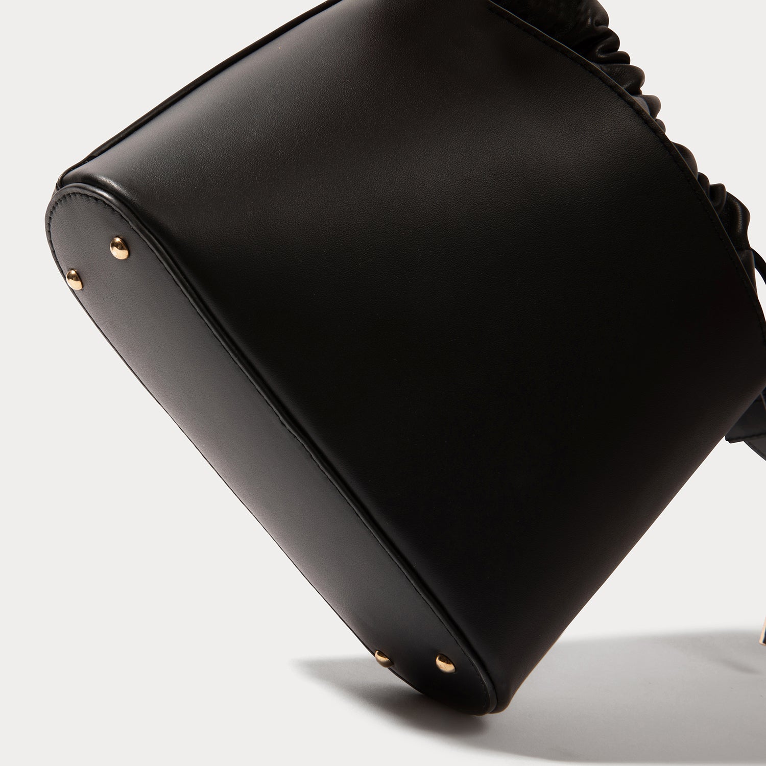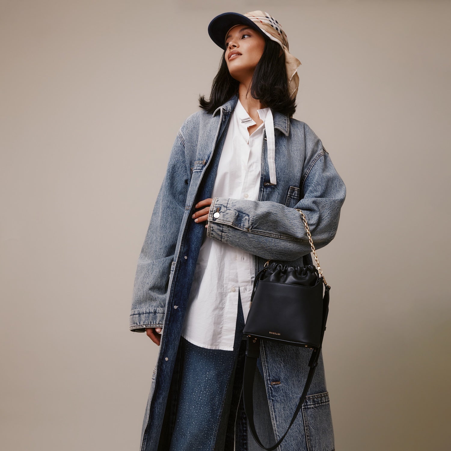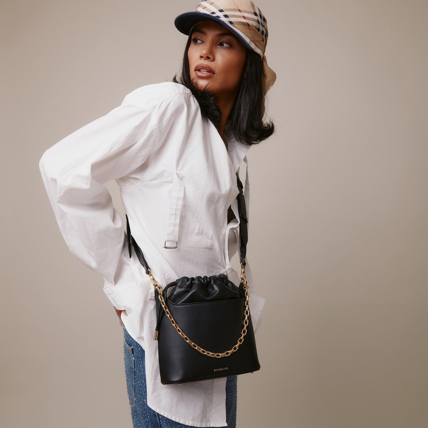 A drawstring bag in an iconic bucket silhouette. Dual straps—crossbody leather and hand-carry length cable chain—add versatile styling options. The signature exterior pocket offers quick access to your phone and other small essentials.