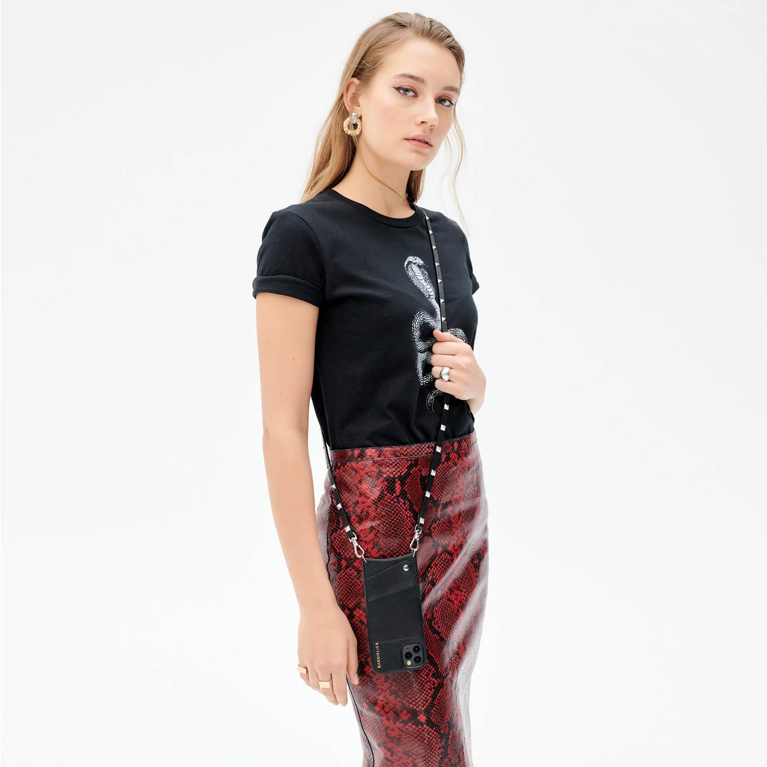 The Sarah Strap features our classic black leather and silver pyramid studs. Sarah is one of our most popular crossbody straps and is the perfect way to further accessorize your other Bandolier styles, mixing and matching is such a fun way to change up your looks!