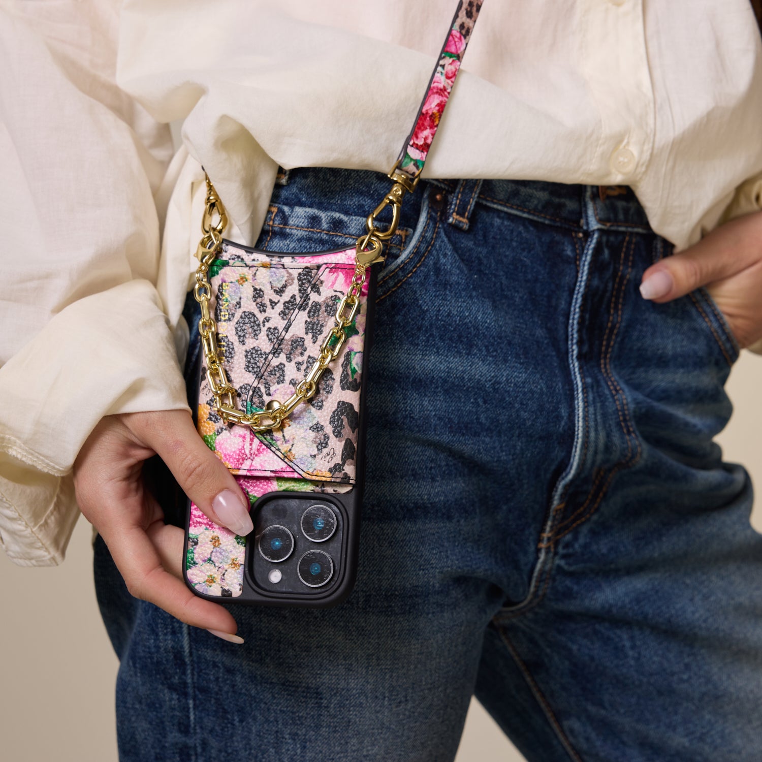 Bold meets function in this limited-edition capsule with designer Ceci Johnson of Ceci New York. Featuring an iconic floral cheetah print on our signature top grain leather, the Valentina Cheetah Set includes a sleek wristlet and a detachable crossbody strap. The case features our patented protective shell, gold-plated connectors, a soft microfiber lining, and a raised bezel for added screen protection.