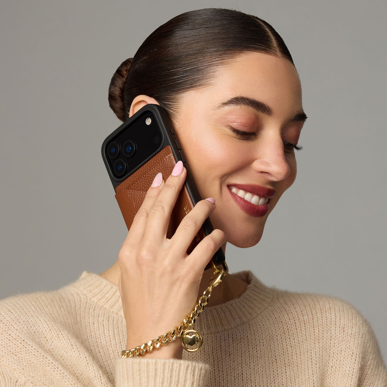 The Maya Wristlet phone case features 100% genuine leather and thick interlocking chain wristlet with two delicate charms. Each case is crafted with a soft microfiber inner lining and raised bezel edge.