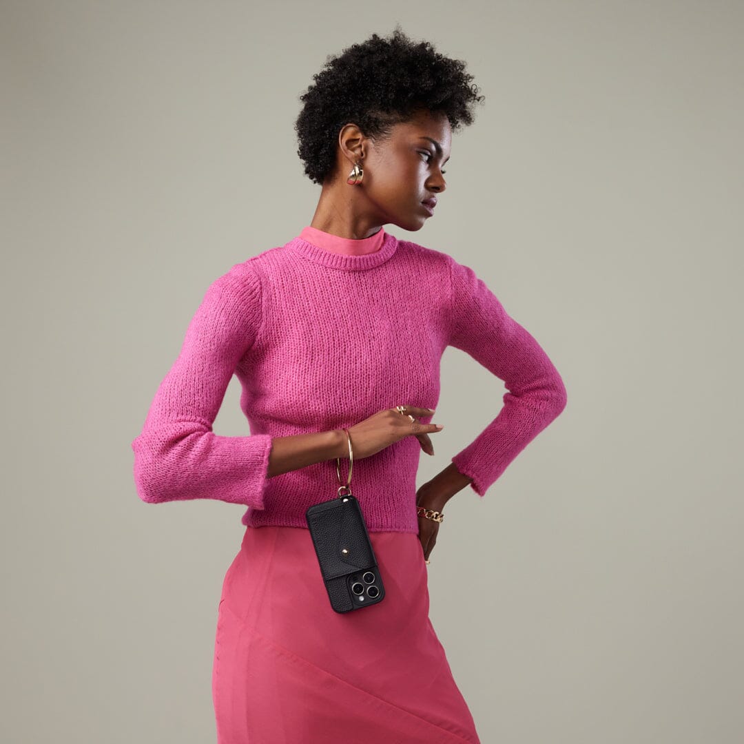 The Gigi O-ring Wristlet features a side-slot wallet iPhone case with a single d-ring for our removable 14k plated gold bangle bracelet and carabiner ring. The O-ring wristlet can be worn alone or as a chic wristlet style with case!