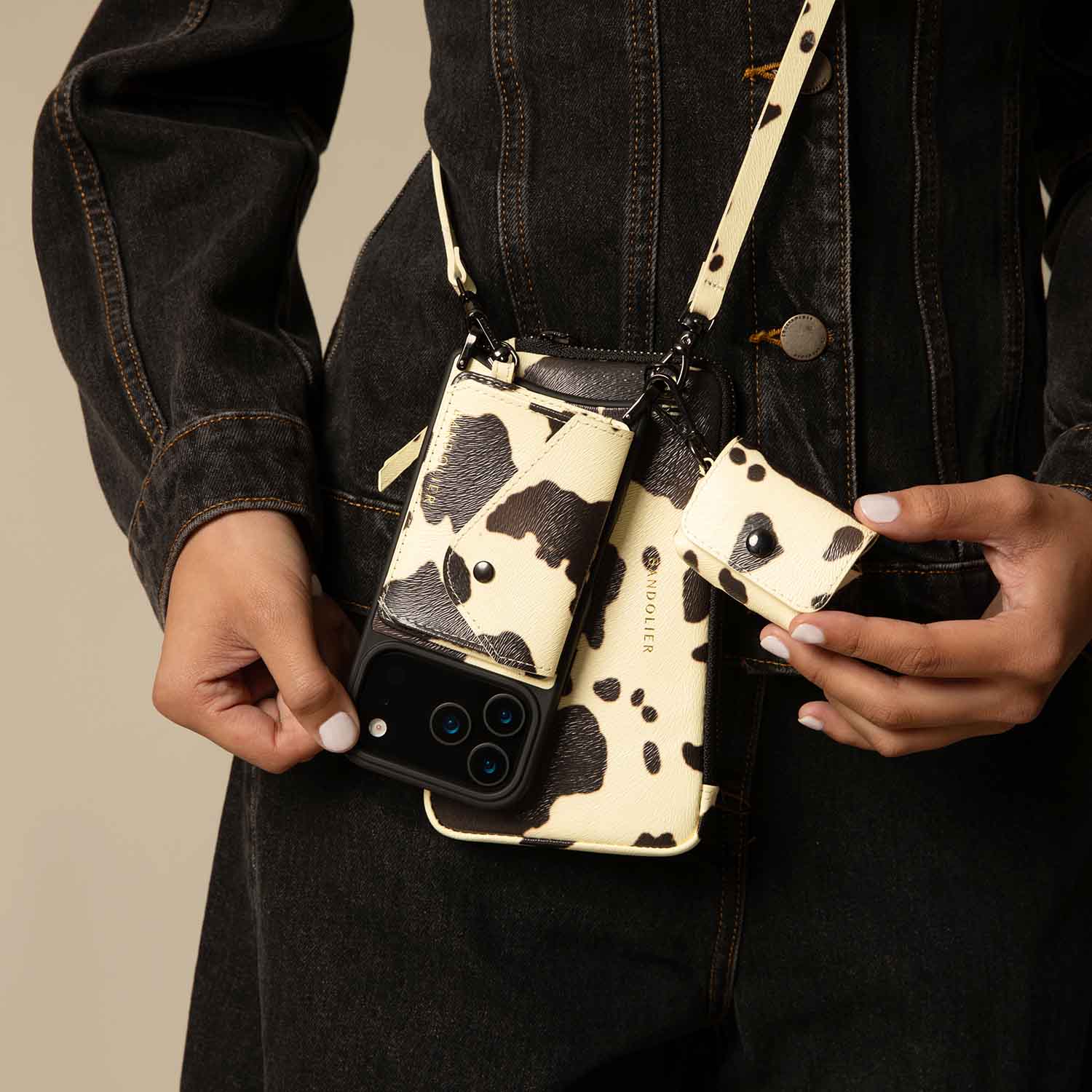 Meet The Remi Essentials Set — the most advanced Bandolier crossbody phone case, plus expanded pouch and AirPods set in a cow inspired print. From detachable wallet to wireless ease, Remi is made to move with modern life. Store your sunglasses in our spacious expander pouch, add your go-to cards in her iPhone wallet pocket and keep your AirPods always within reach.