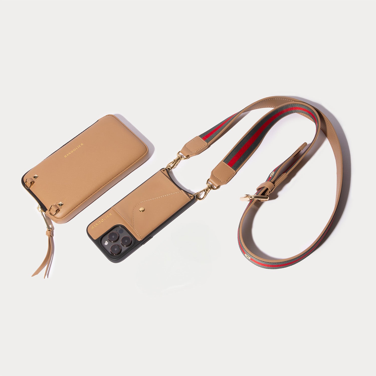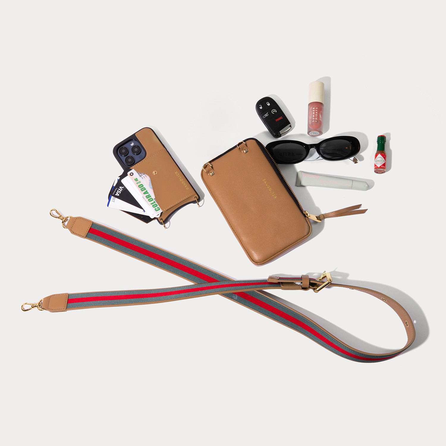 The first-ever genuine leather luxury set crafted to triple your hands-free space in two minimalist pieces. Store your sunglasses in Kimberly's spacious expander pouch, add your go-to cards in her iPhone wallet pocket. Link them together to keep everything you need while on-the-go in one spot!