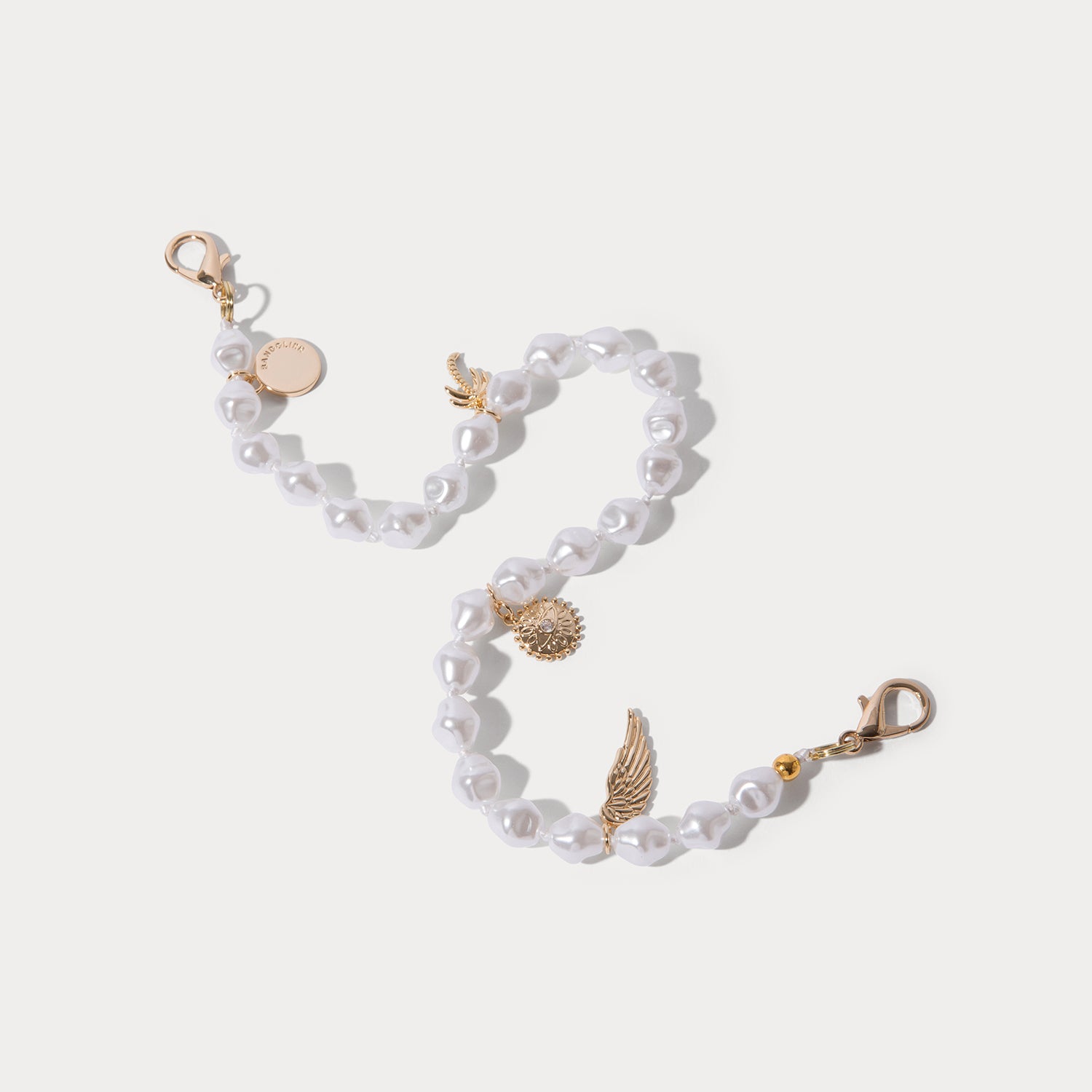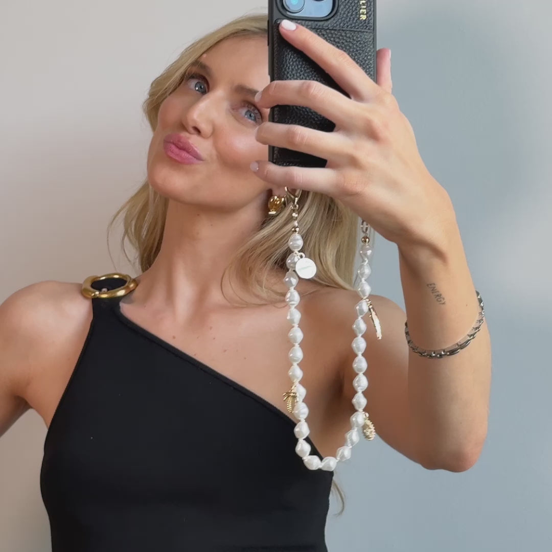 Meet The Selena Wristlet, designed to attach seamlessly to any Bandolier case, this luxe accessory features delicate pearls and charming trinkets. It’s the perfect addition to your Bandolier collection!