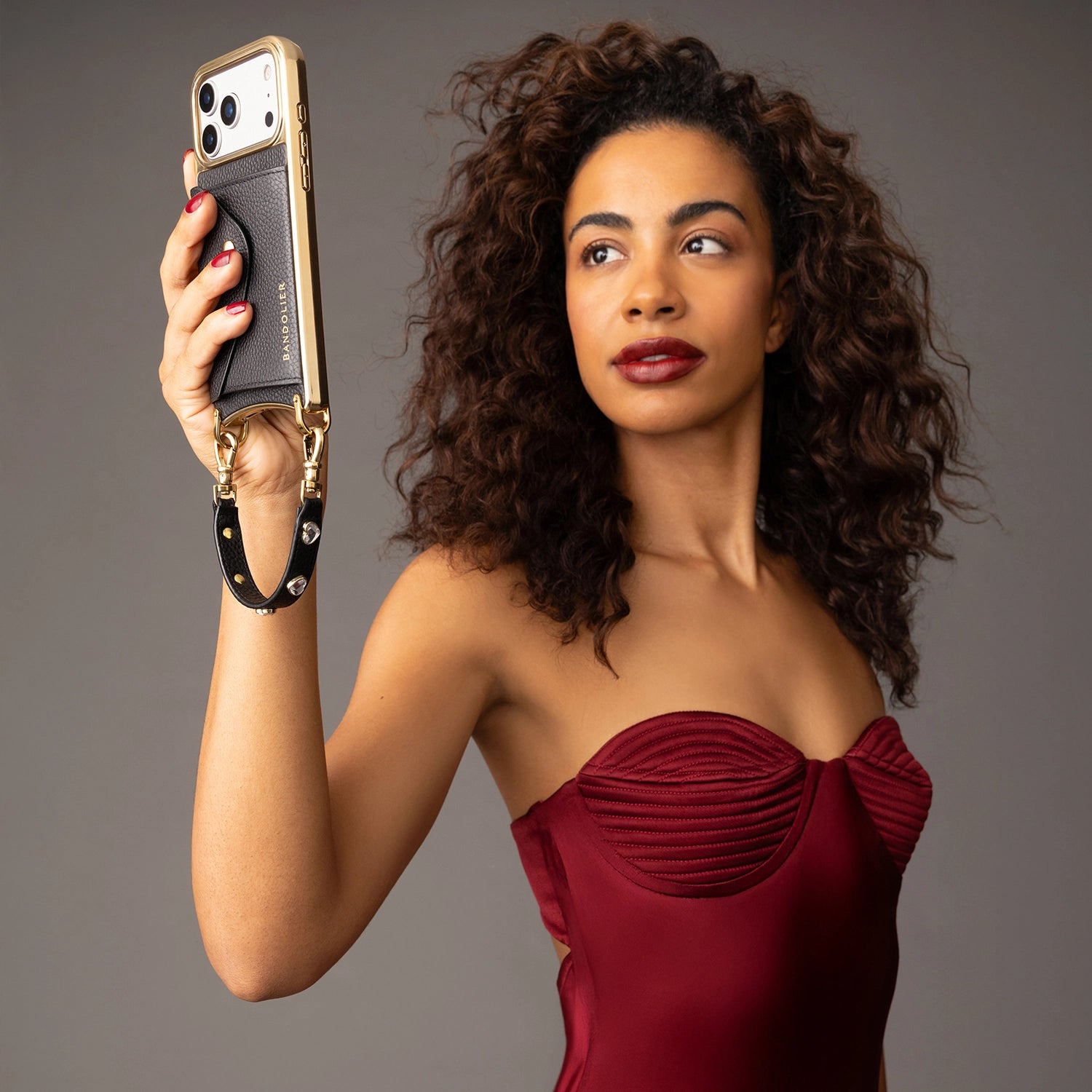 Crafted from top grain leather and accented with gold hardware, the Demi wristlet is embellished with heart shaped crystals from Swarovski®. Designed with dual gold clasps, it easily attaches to your Bandolier phone case for a secure, hands-free carry.