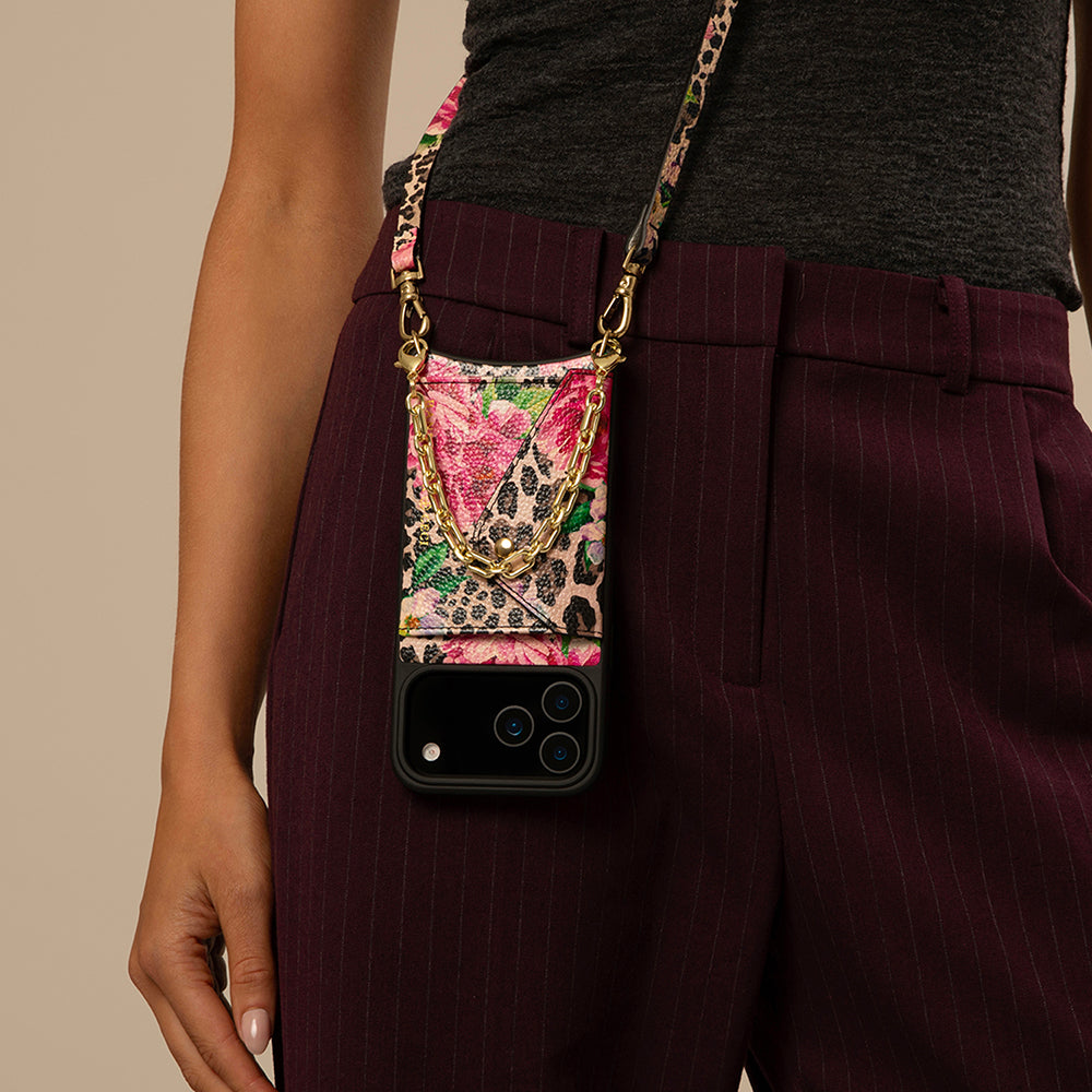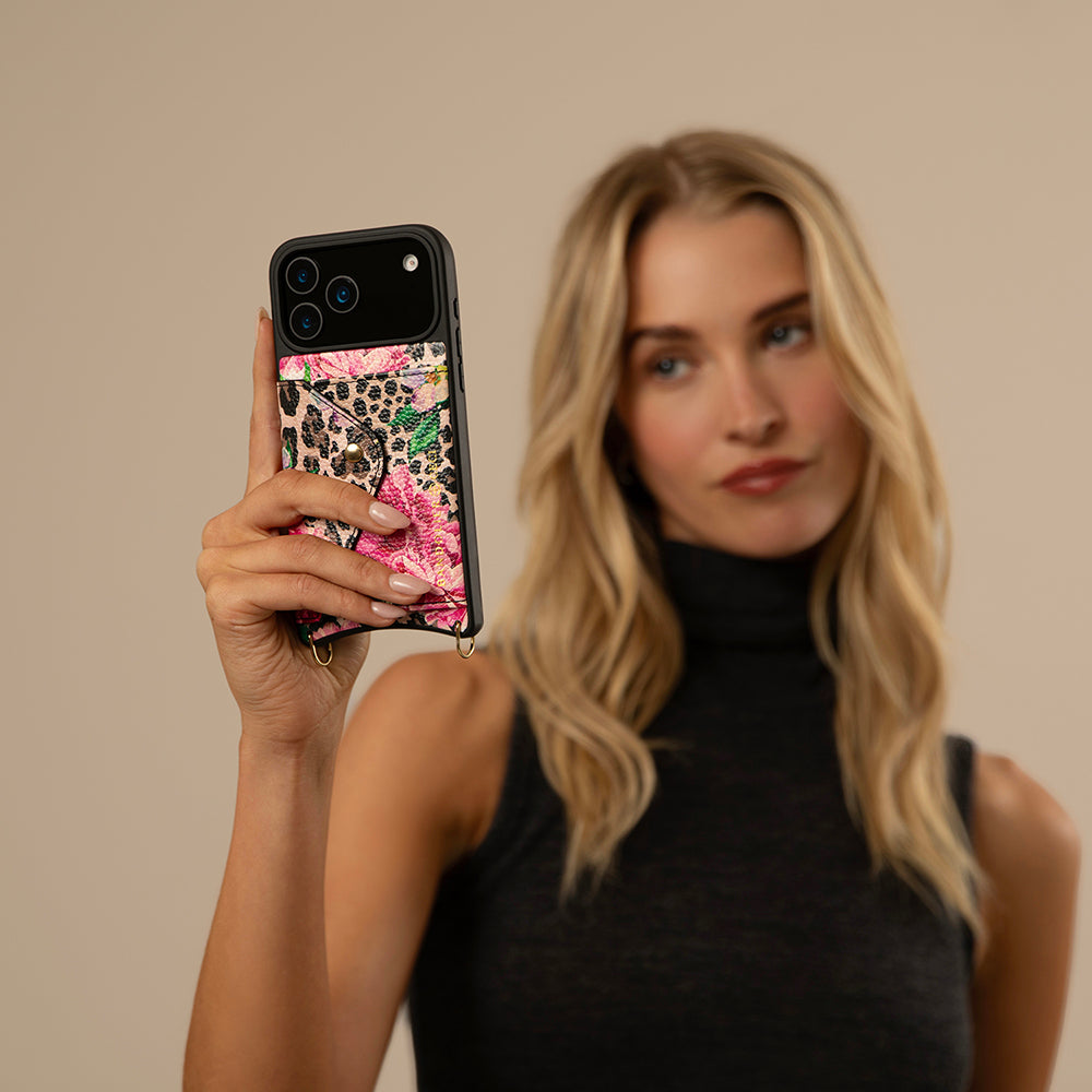 Bold meets function in this limited-edition capsule with designer Ceci Johnson of Ceci New York. Featuring an iconic floral cheetah print on our signature top grain leather, the Valentina Cheetah Set includes a sleek wristlet and a detachable crossbody strap. The case features our patented protective shell, gold-plated connectors, a soft microfiber lining, and a raised bezel for added screen protection.