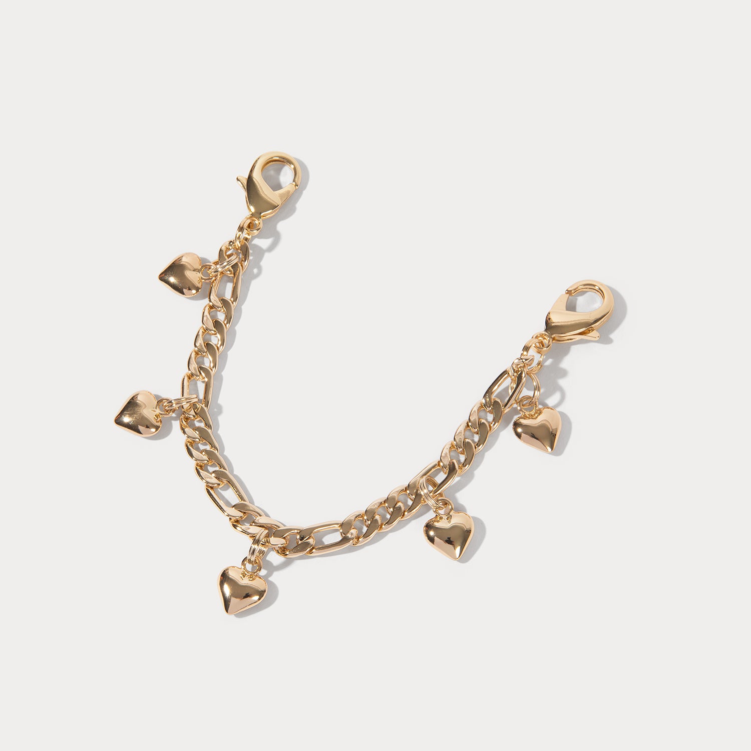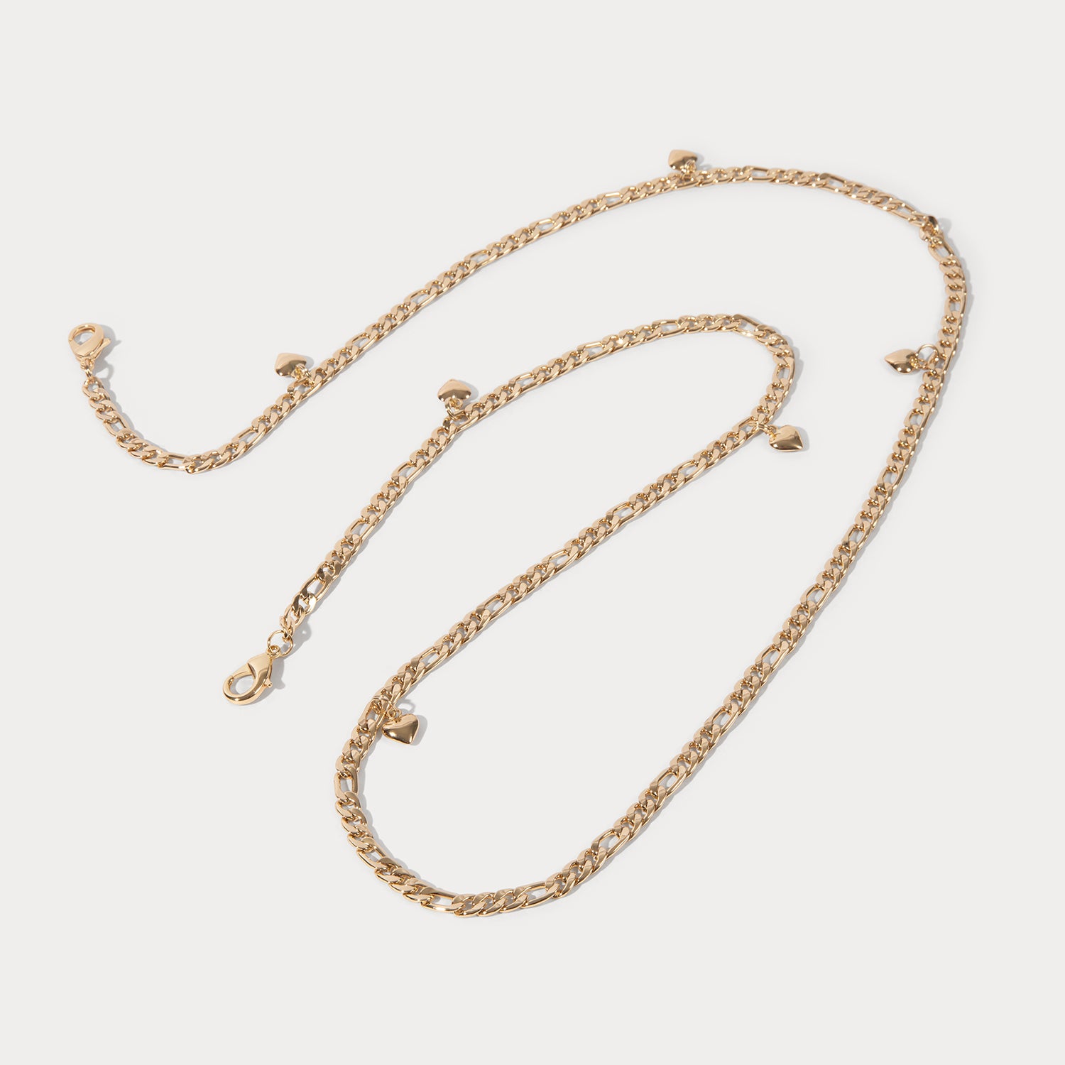 This limited-edition Estelle Heart Strap Set features a gold Figaro-style chain accented with delicate heart charms. Easily attach with lobster clasps, this versatile crossbody strap and wristlet can be added to any Bandolier case.