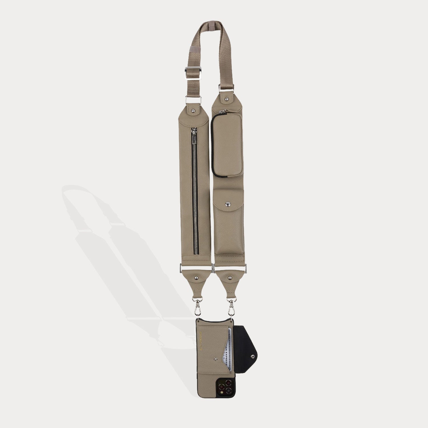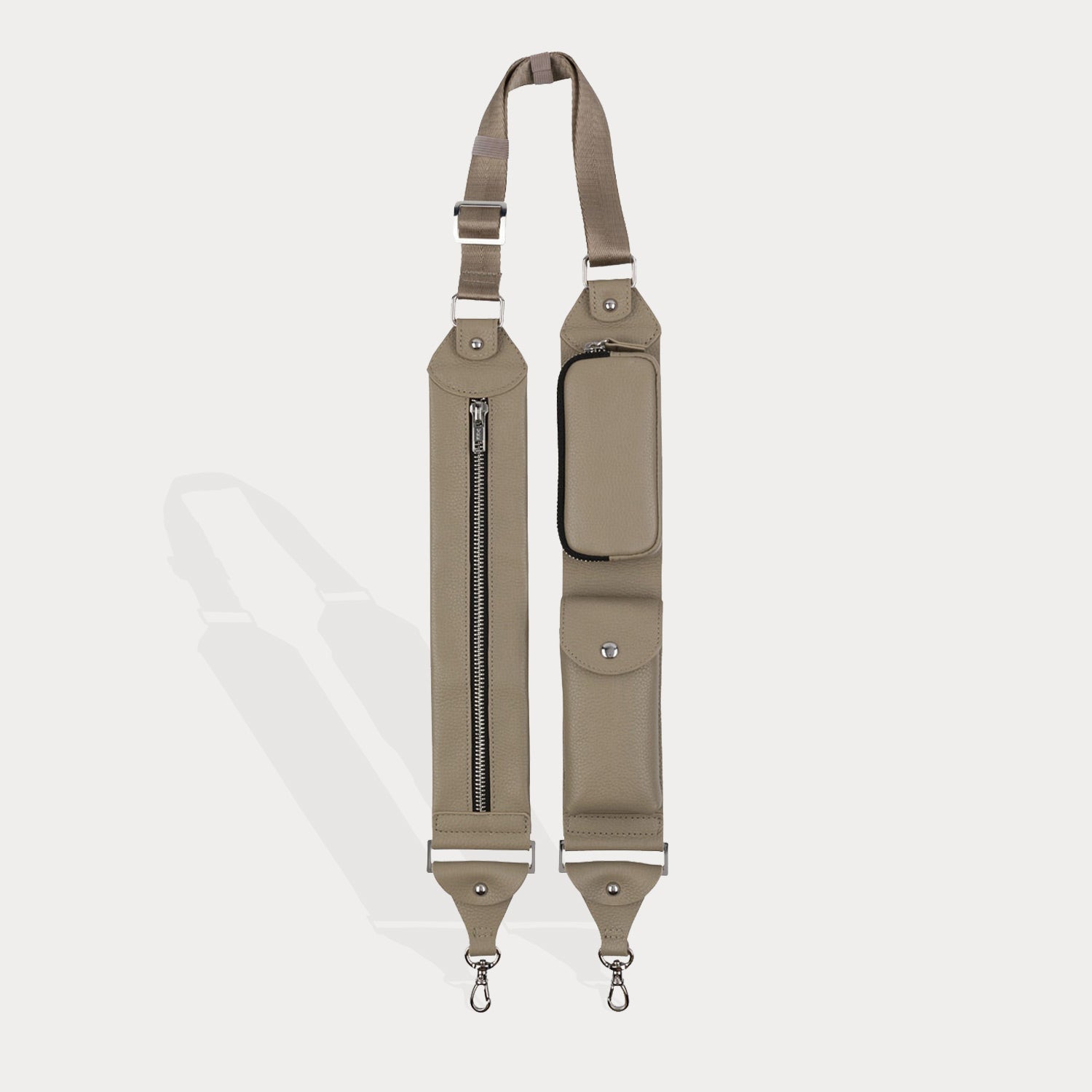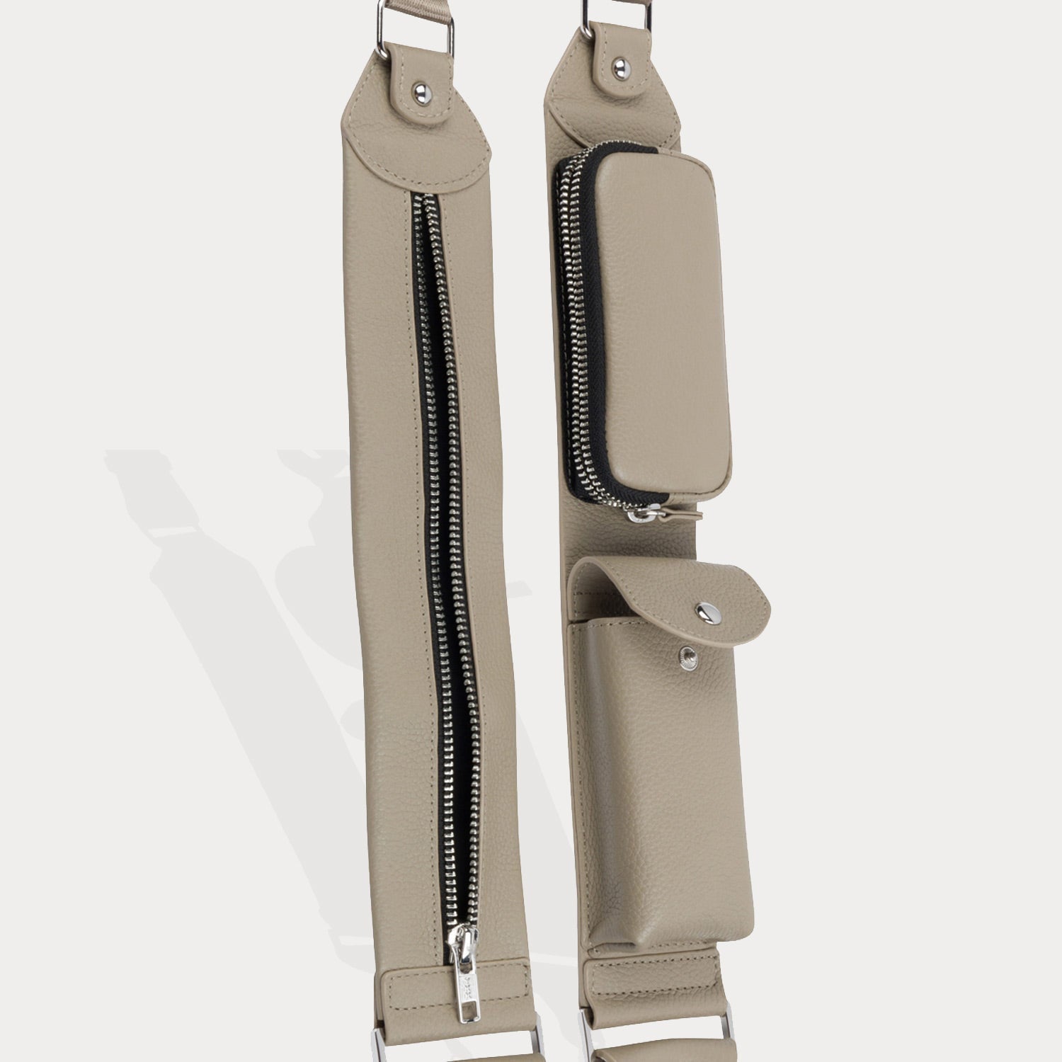 The Billie Strap is a multi-pocketed, adjustable, utility strap accessory for you Bandolier case. This blend of beige and grey pebbled leather design features 3 distinct compartments and shoulder adjustment. With silver vacuum plated hardware throughout the entire design, this bold show-stopper will hold everything from your charger to lipgloss to keys to eyeliners, you name it.