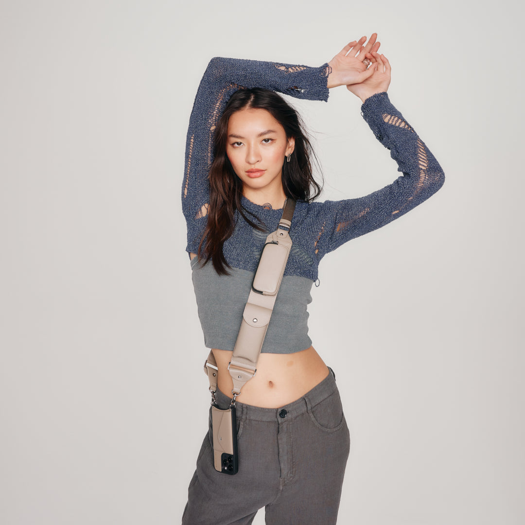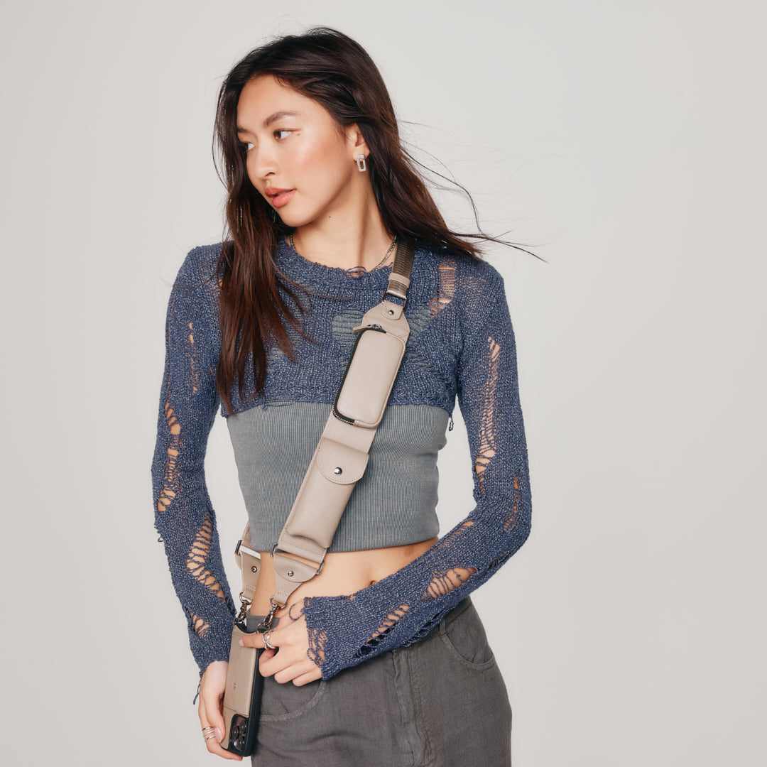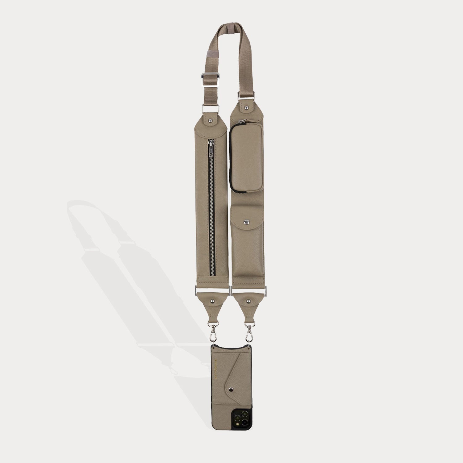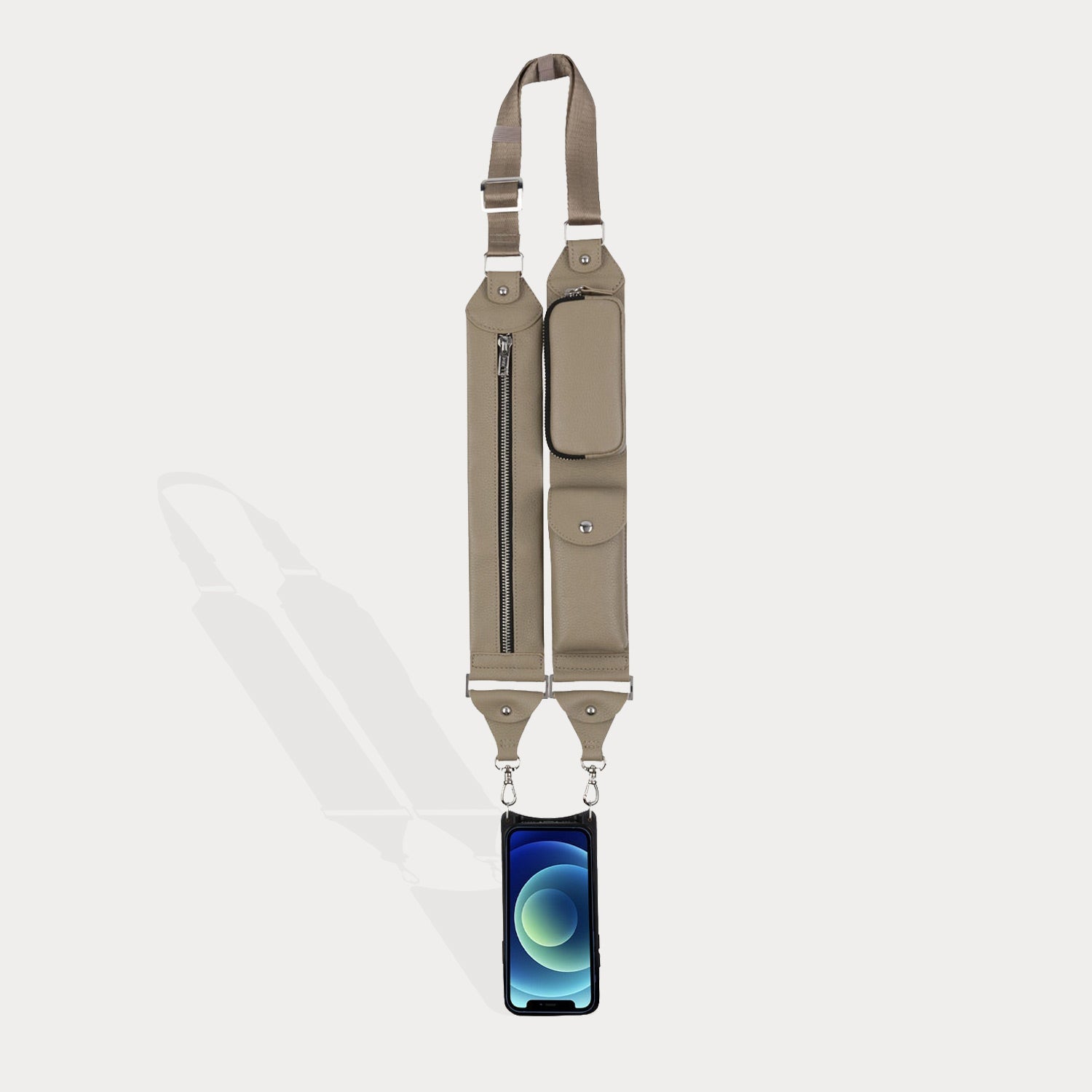 The Billie Strap is a multi-pocketed, adjustable, utility strap accessory for you Bandolier case. This blend of beige and grey pebbled leather design features 3 distinct compartments and shoulder adjustment. With silver vacuum plated hardware throughout the entire design, this bold show-stopper will hold everything from your charger to lipgloss to keys to eyeliners, you name it.