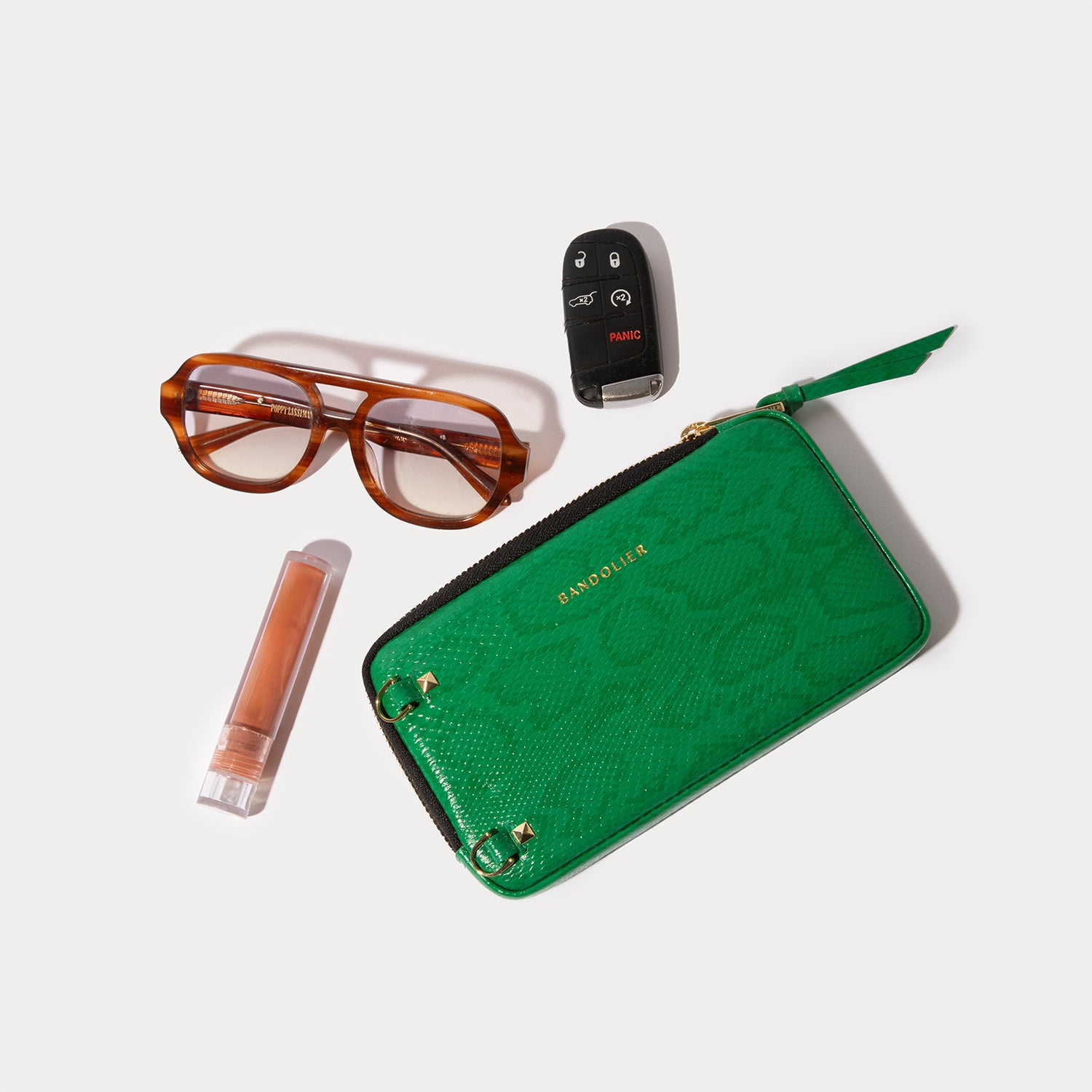 Embossed Leather Expanded Zip Pouch in Green Snake/Gold