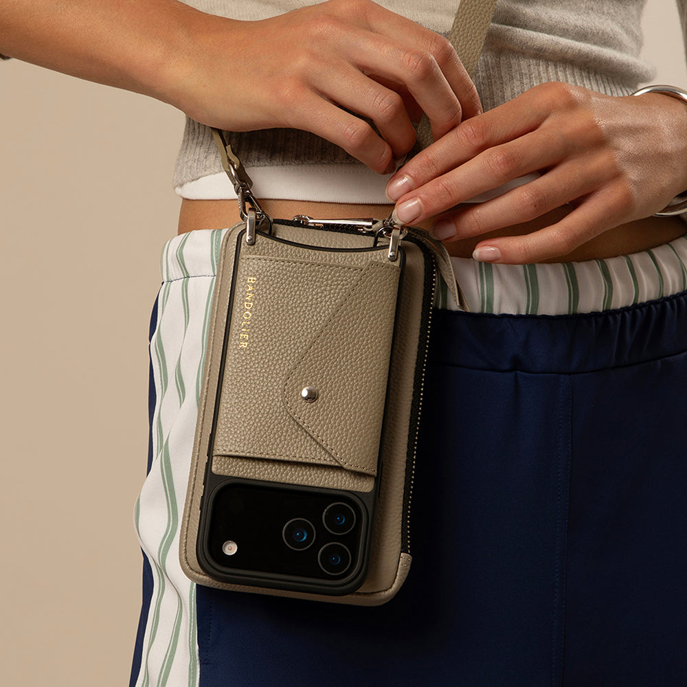 The first-ever genuine leather luxury set crafted to triple your hands-free space in two minimalist pieces. Store your sunglasses in Hailey's spacious expander pouch, add your go-to cards in her iPhone wallet pocket. Link them together to keep everything you need while on-the-go in one spot!