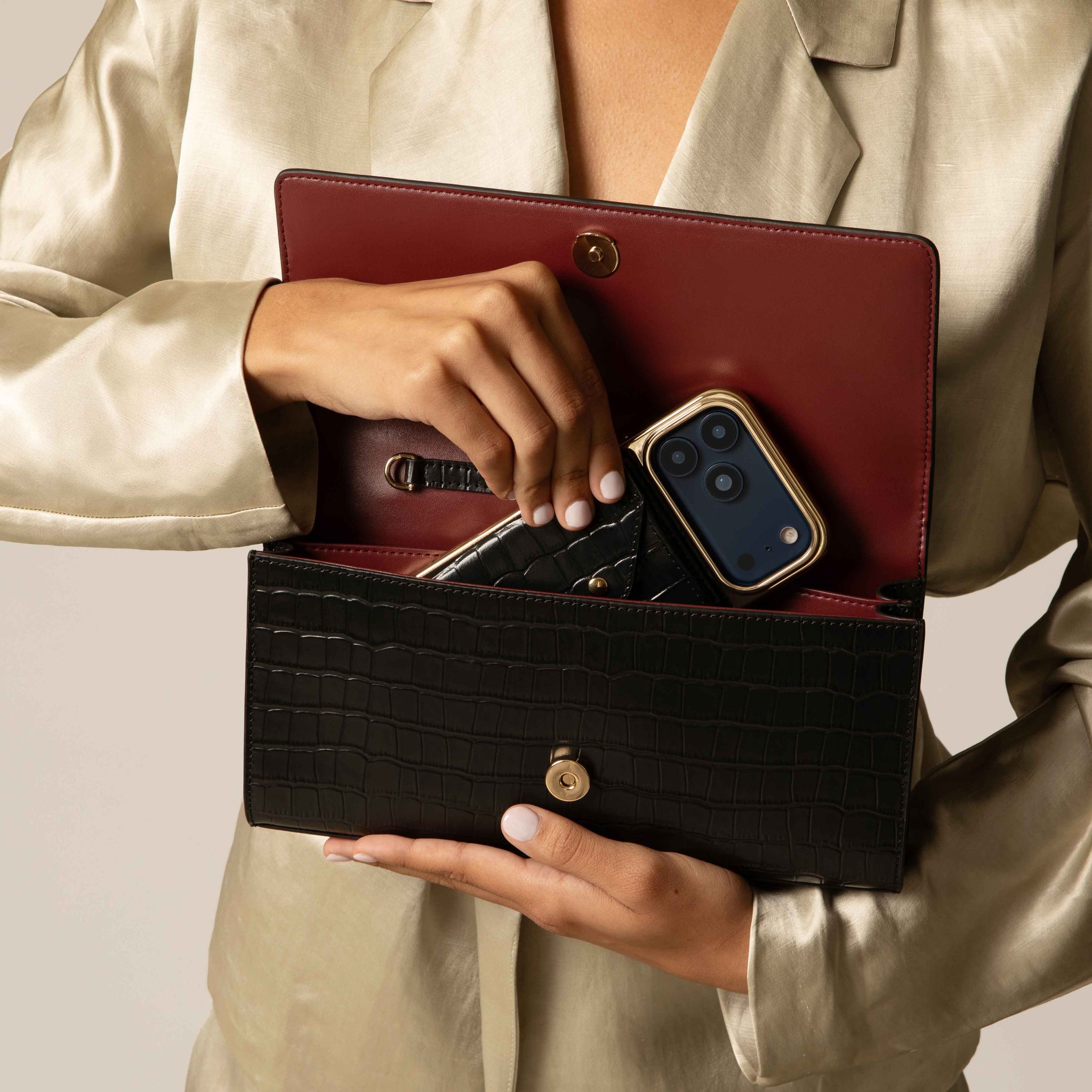 An Exceptionally Elegant Way to Carry Your Phone. With a divided interior that keeps your phone easy to find, the Maeve Bag features a structured east-west silhouette crafted from croc-embossed leather. It’s finished with a magnetic flap closure, wine-colored leather lining, and interior slip and zip pockets for added organization. A detachable gold snake chain lets you wear it as a shoulder bag—or remove the chain and carry it by the top handle when you want to switch it up.