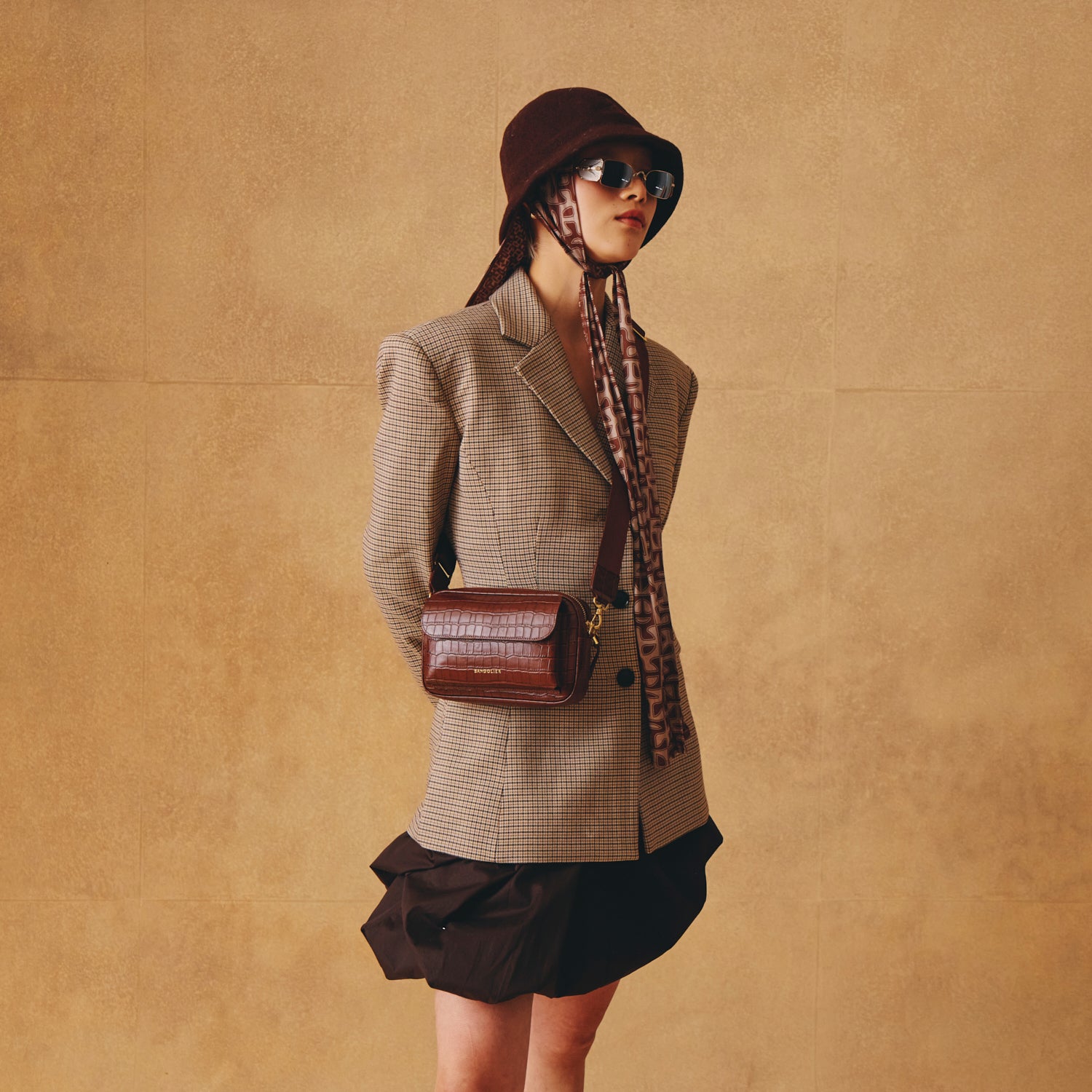 Embossed Croc Leather Crossbody Bag in Brown Croc/Gold