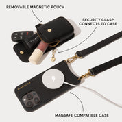 Meet the River! Our newest phone case crafted with a flat surface that supports hassle-free MagSafe charging, making it as functional as it is stylish. The removable magnetic pouch itself is secured with a robust clasp that fastens directly to the D-ring on your phone case and zipper and snap flap closure ensuring everything you need is right at your fingertips.