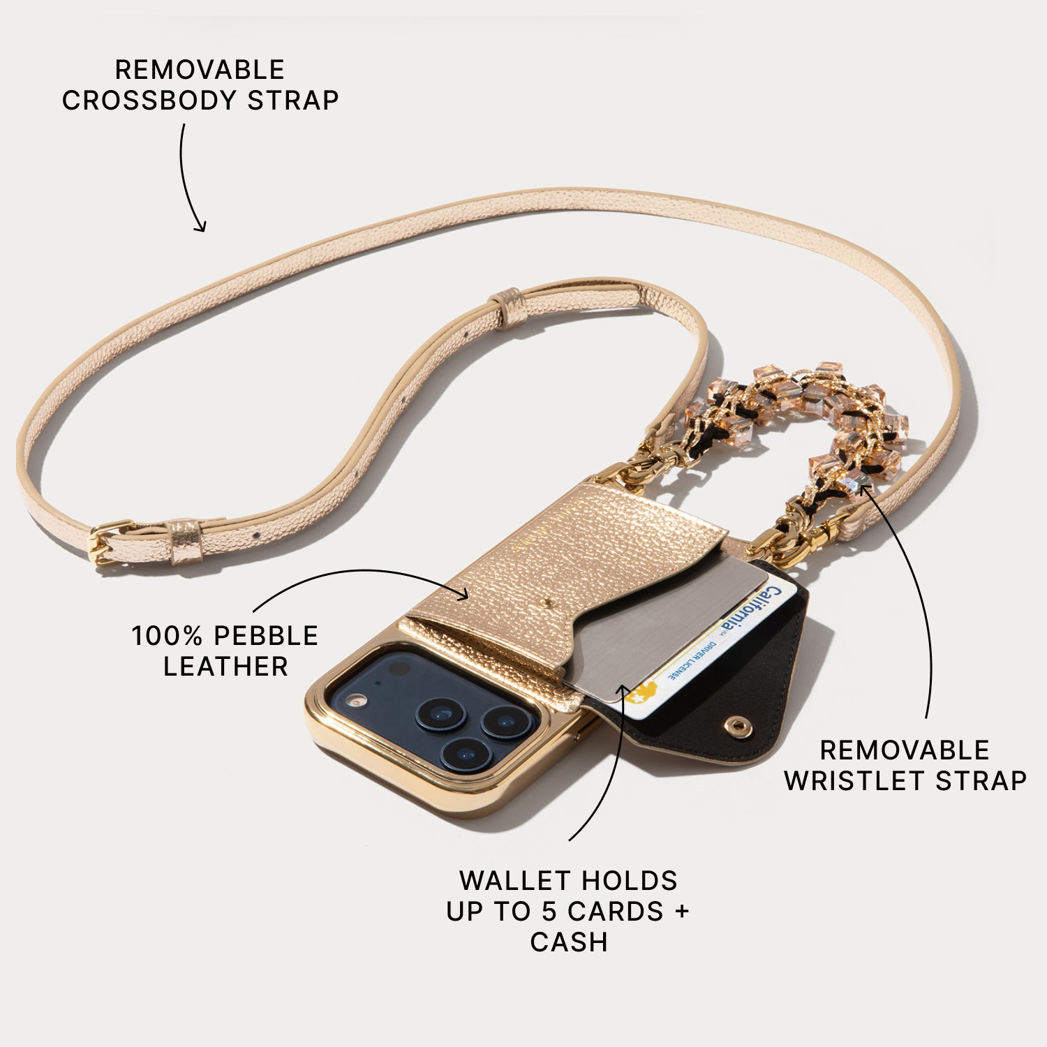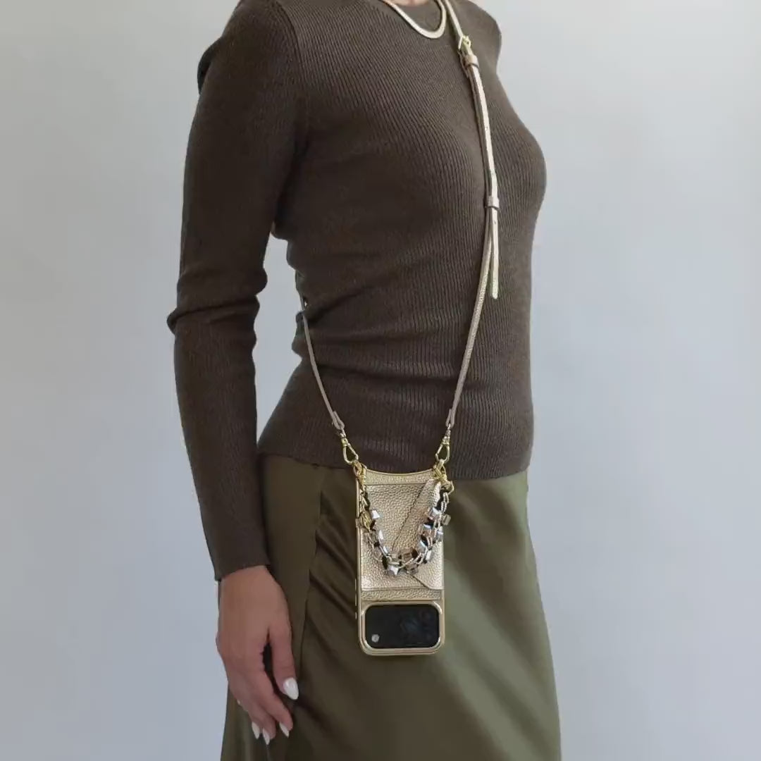 All shine, no subtlety. The Chrome Gift Set was made for the spotlight. It features the Donna Metallic Case in full chrome with a built-in wallet, plus two bold styling options: a matching metallic leather crossbody strap for hands-free wear, and a crystal wristlet strap for moments that call for full sparkle. Designed to command attention at holiday parties—and shine straight into the new year. One case. Two straps. Endless dazzle. Essentials always within reach.