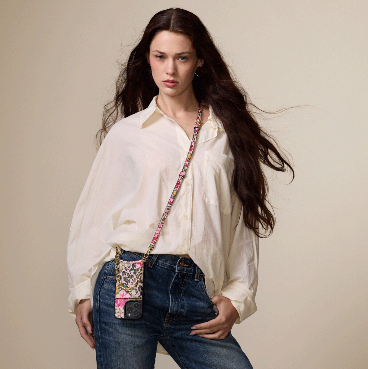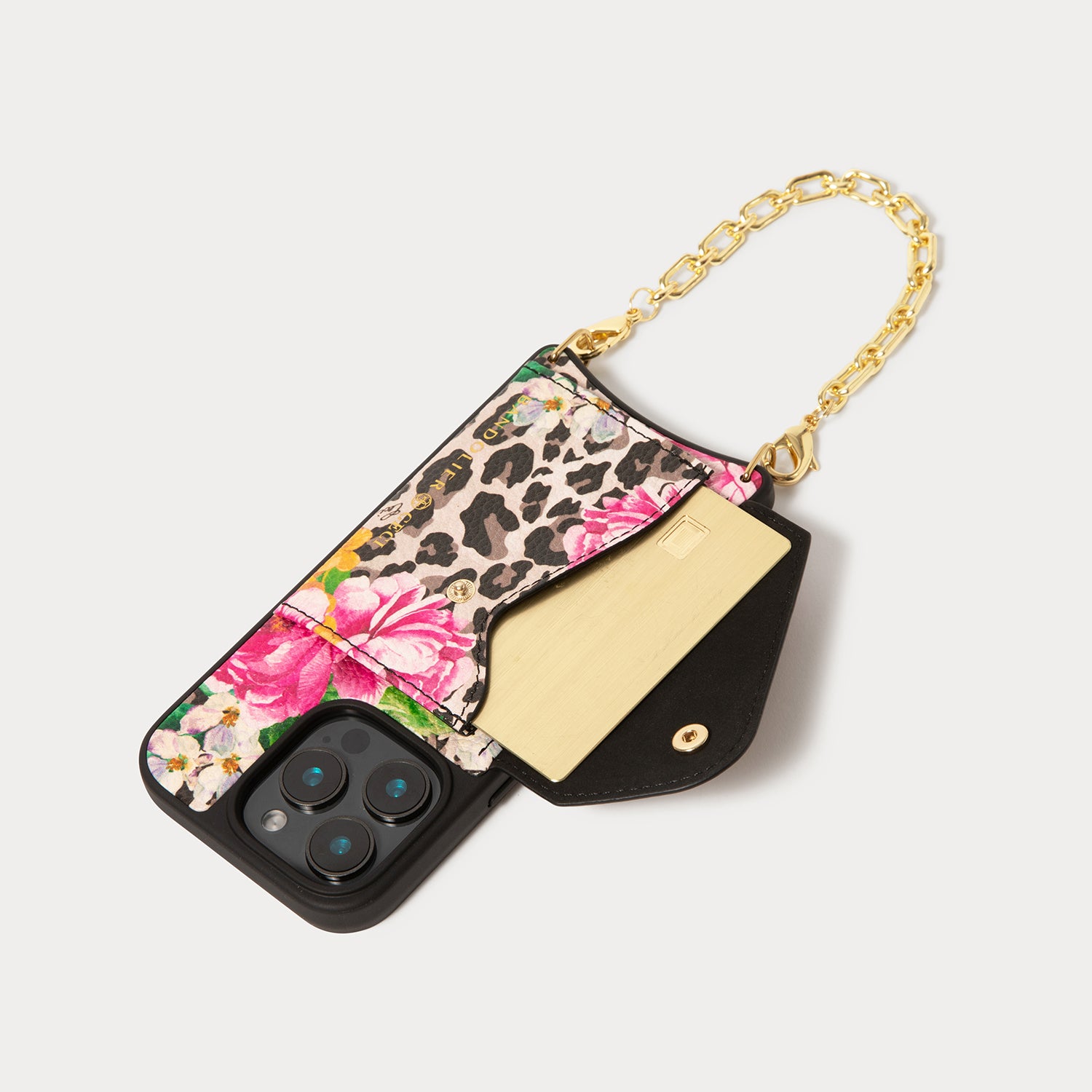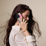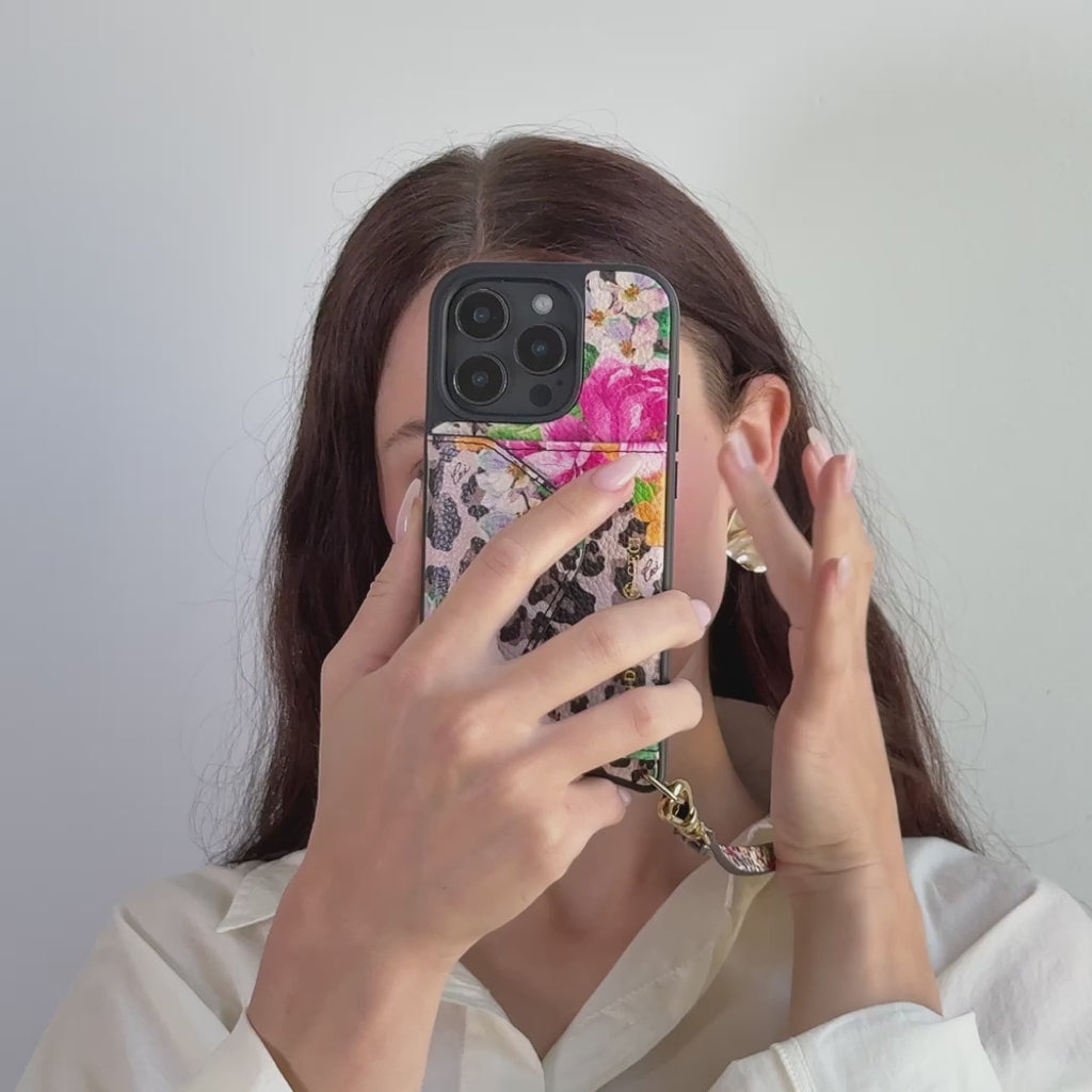 Bold meets function in this limited-edition capsule with designer Ceci Johnson of Ceci New York. Featuring an iconic floral cheetah print on our signature top grain leather, the Valentina Cheetah Set includes a sleek wristlet and a detachable crossbody strap. The case features our patented protective shell, gold-plated connectors, a soft microfiber lining, and a raised bezel for added screen protection.