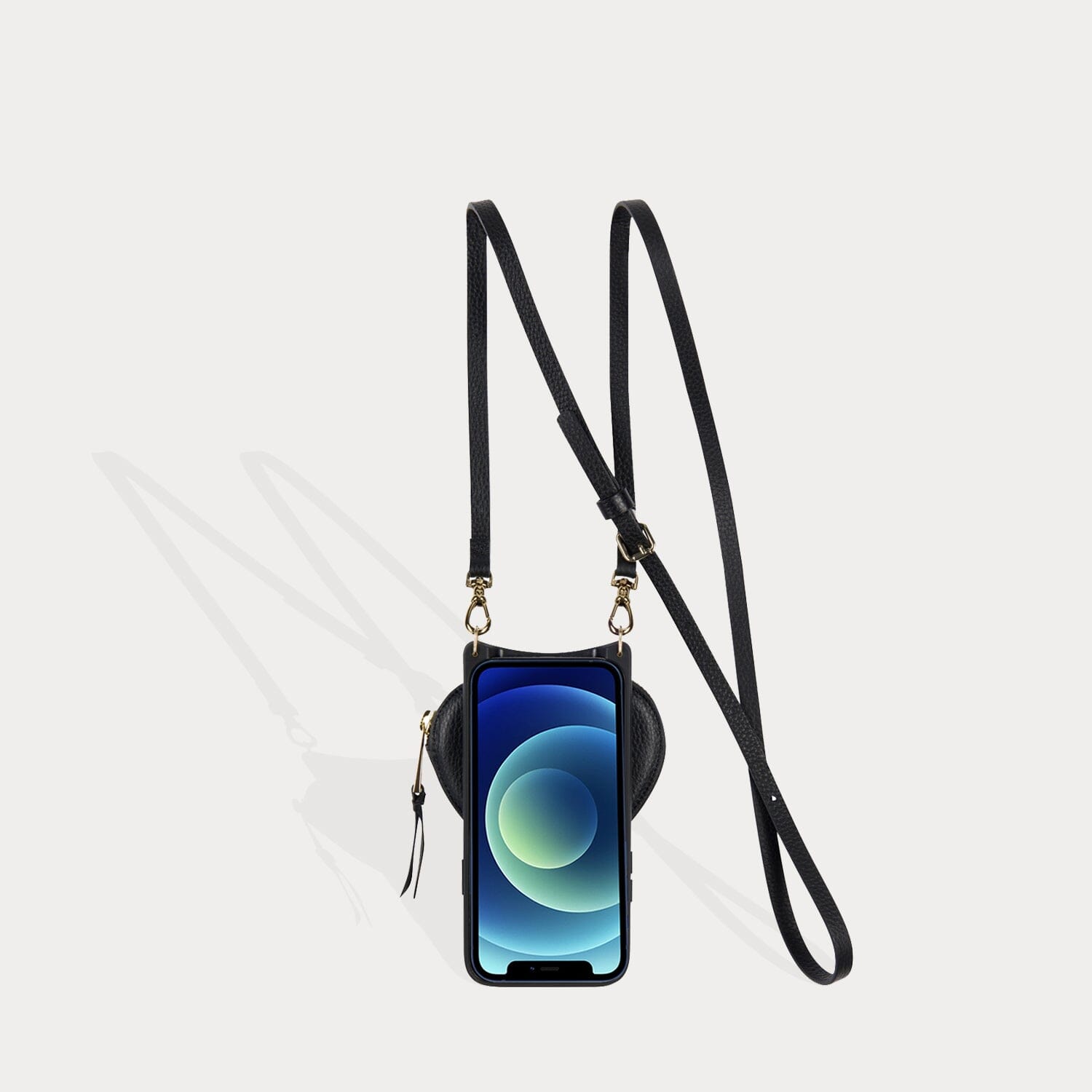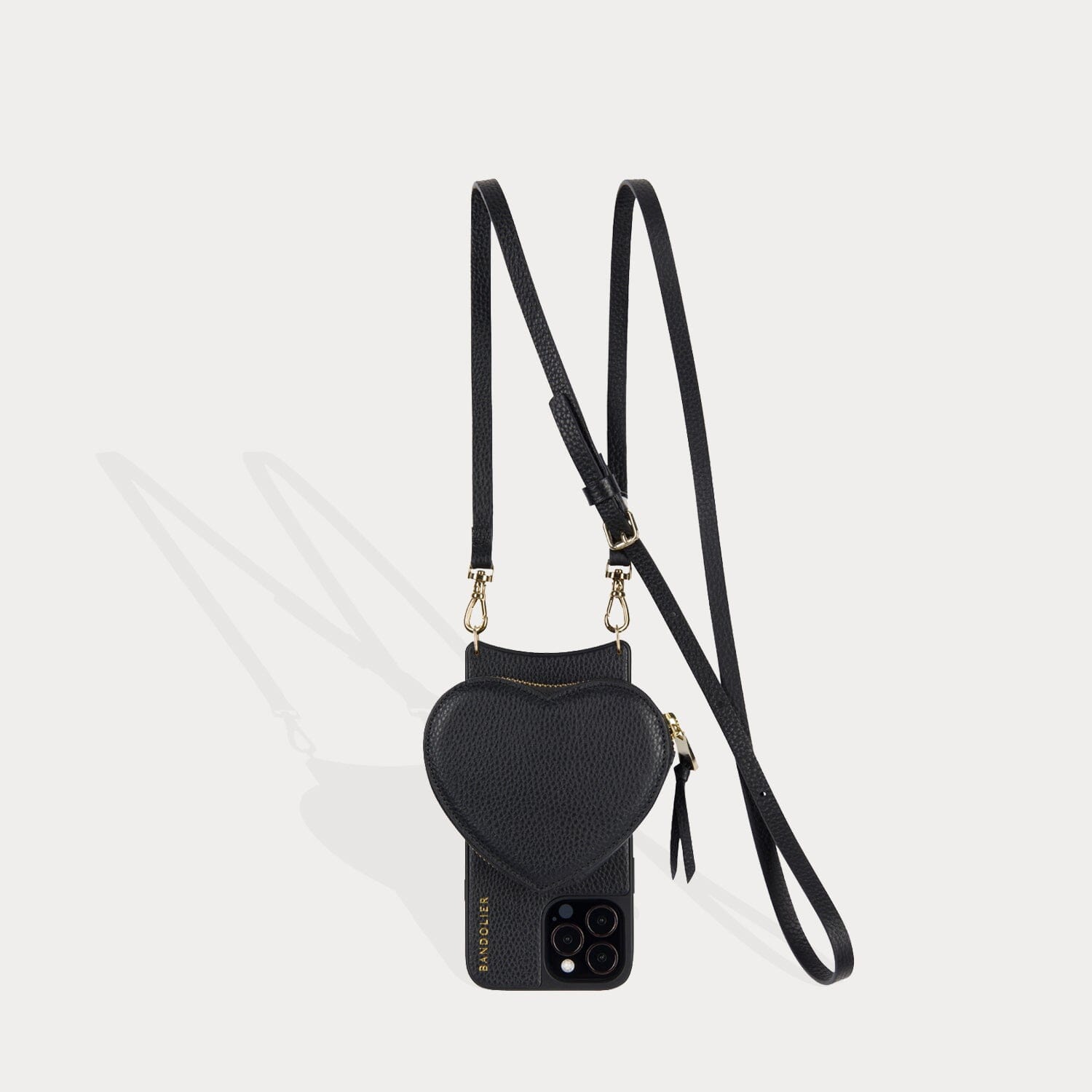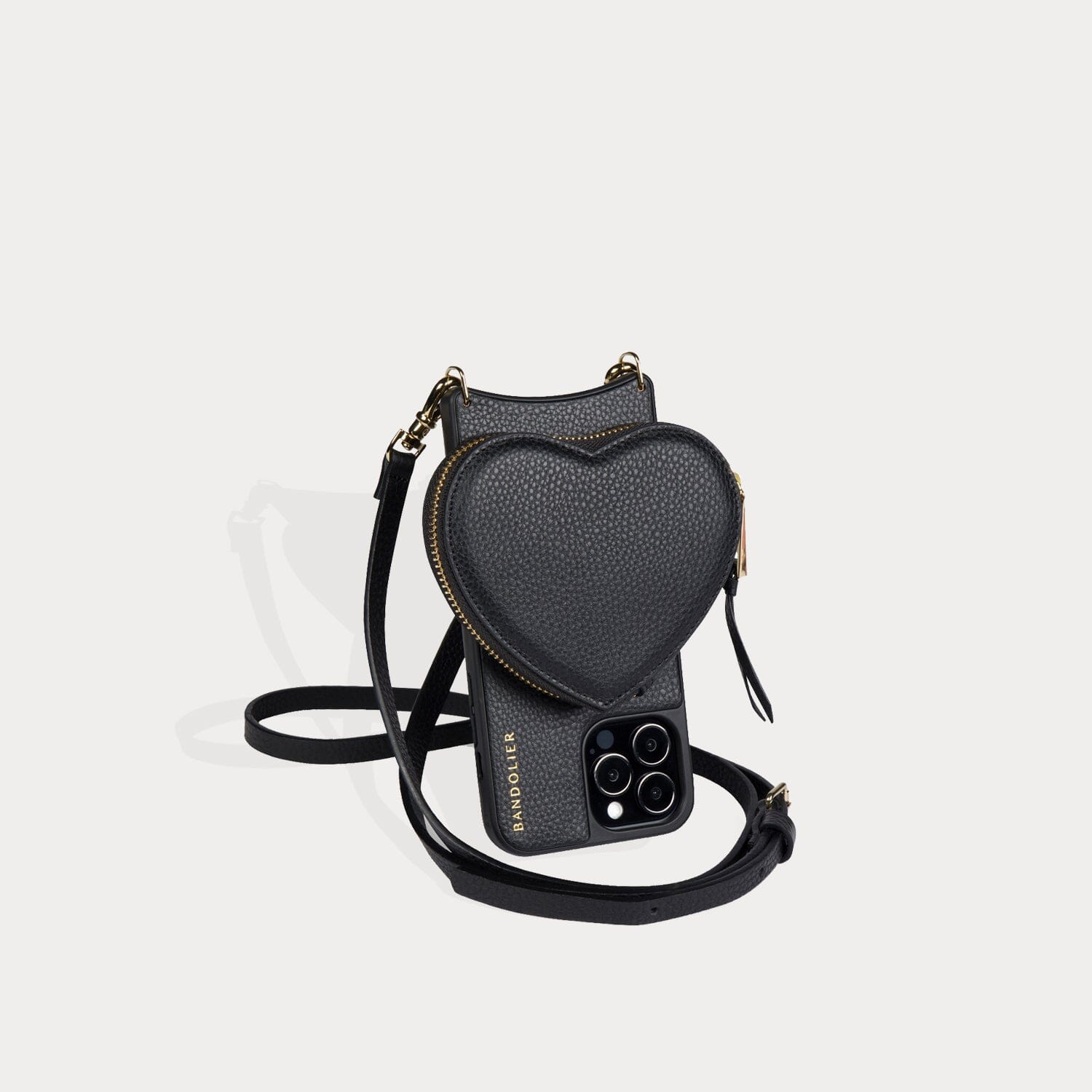 Meet the Willa Heart Case Bandolier. This crossbody Bandolier phone case with attached heart shaped zip pouch is our new favorite. The Willa features luxurious black top grain leather and gold vacuum-plated hardware, with a customer metal and leather zipper pull. The adjustable leather crossbody strap makes sure you have the perfect fit. The heart pouch features an interior credit card pocket and fits lipstick, keys, cash, coins and other small items.